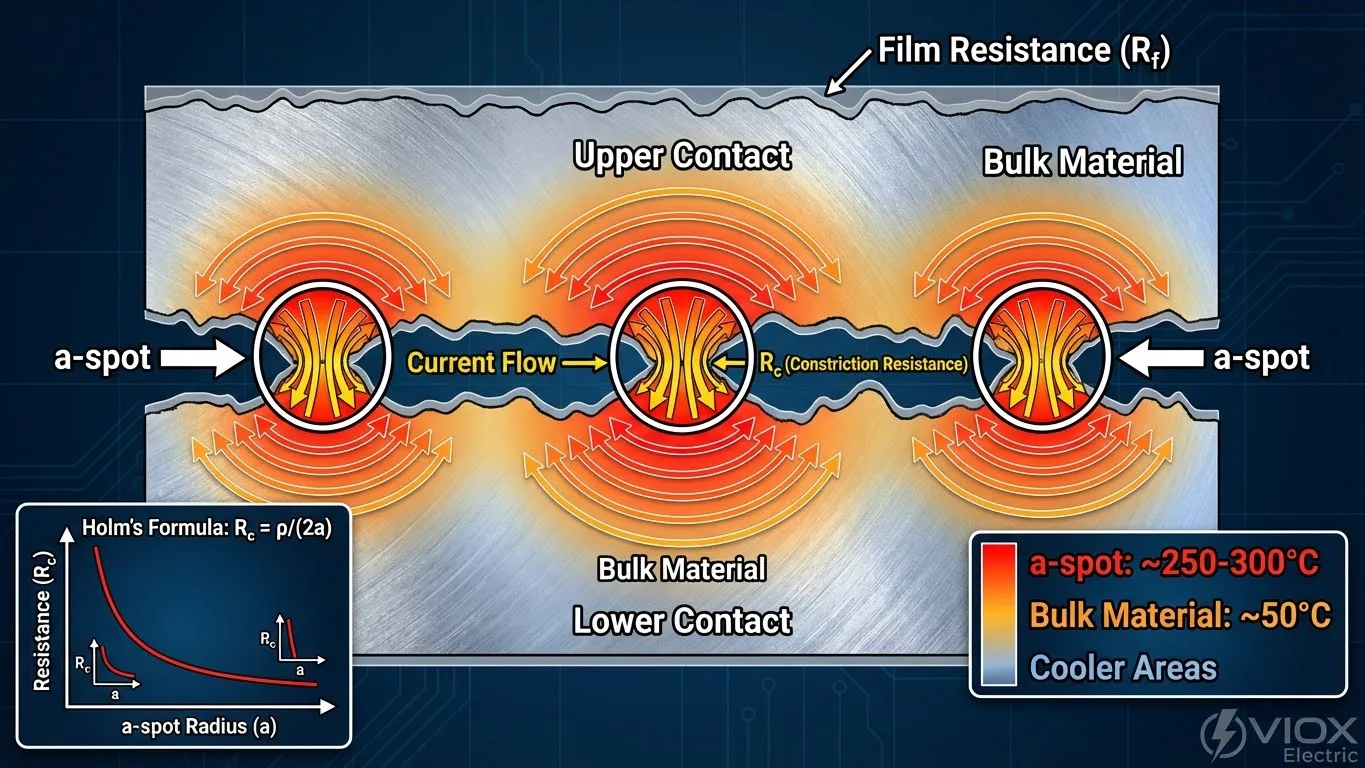¿Por qué es importante esto? La corriente debe pasar a través de estos minúsculos puntos a, causando resistencia de constricción—resistencia local que excede con creces lo que predeciría la conductividad volumétrica. La relación sigue la fórmula de Holm: