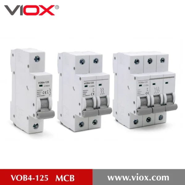 MCB profesional para aplicaciones de carga pesada de 80A-125A – Los interruptores automáticos en miniatura de la serie VIOX VOB4-125 proporcionan una protección fiable de alta corriente para cuadros de distribución principales, edificios comerciales e instalaciones de carga pesada. Certificación IEC 60898-1 con capacidad de ruptura de 6kA, durabilidad mejorada de 6000 ciclos eléctricos, clasificado de 80A a 125A.